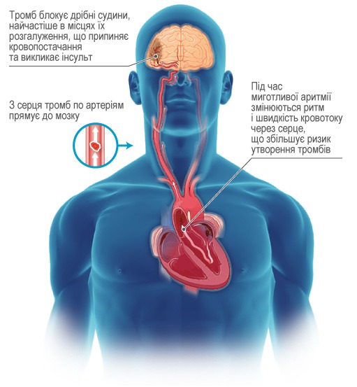 У випадку ФП серцеві камери скорочуються хаотично і нерівномірно. Це може спричинити накопичення крові в передсердях серця, і утворення згустків крові. Ці згустки крові можуть потім переміститися через кровоток до мозку, де вони блокують кровоносні судини, і це викликає інсульт. Небезпечною стороною ФП є те, що близько 70% випадків ФП безсимптомні та залишаються недіагностованими. Крім того, на початку ФП в цілому з'являється лише нерегулярно і тому може бути пропущена навіть під час періодичних візитів до лікаря. Наступні фактори ризику можуть додатково збільшити ризик розвитку ФП: вік, гіпертонія, діабет, ожиріння, серцево-судинні захворювання, стрес, куріння та алкоголь.