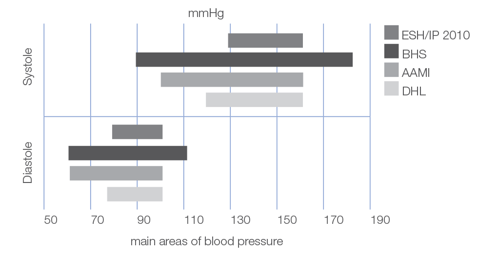 Ще одна відмінність в досліджуваних діапазонах артеріального тиску: Діапазони артеріального тиску, в яких перевіряються тонометри для вимірювання точності, розрізняються залежно від протоколу (див. Графік). Чим ширше діапазон, тим краще прилади перевірені на надійність при надзвичайно низькому або надзвичайно високому артеріальному тиску.